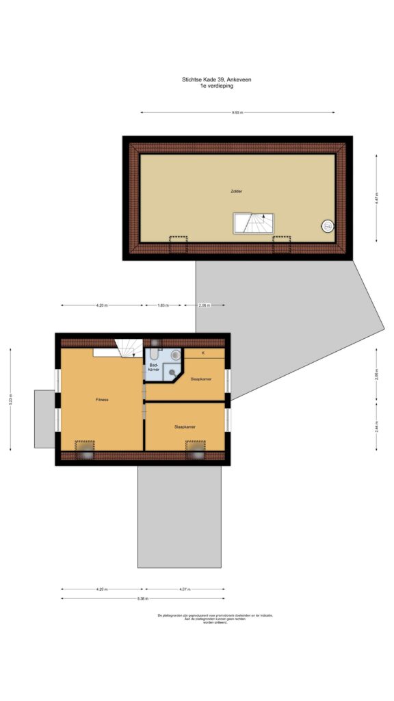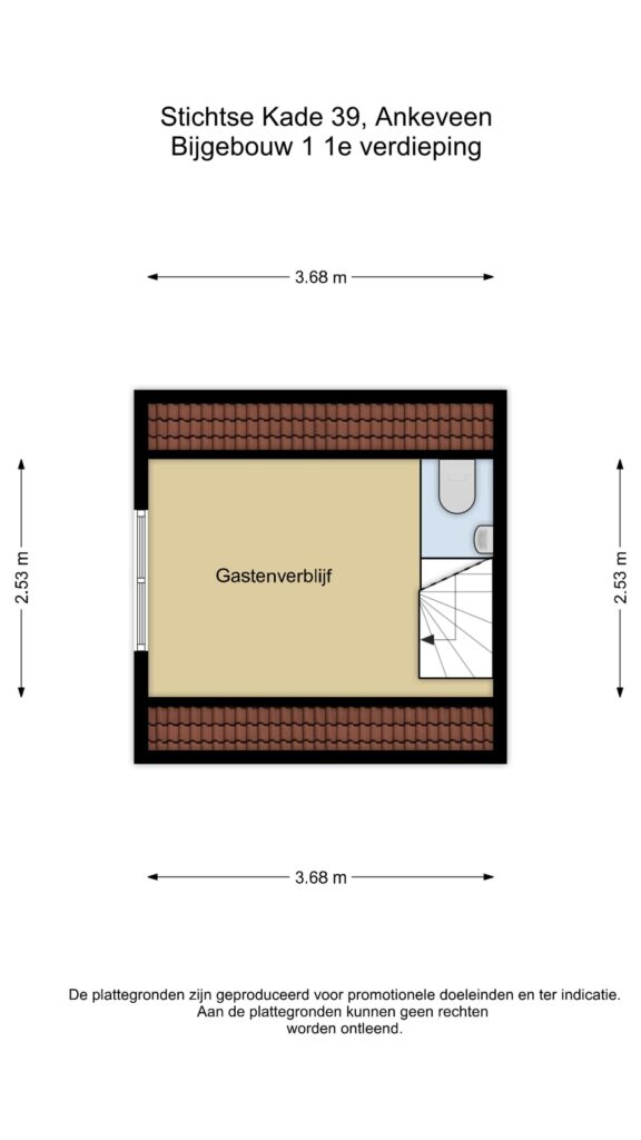 1e Verdieping: hier vindt u een slaap-/werkkamer (momenteel in gebruik als fitnessruimte) met dakraam en bergruimte, een tweede slaapkamer met dakraam, en een derde kamer die is ingericht als walk-in closet met inbouwkast. De badkamer op deze verdieping beschikt over een douchecabine, wastafelmeubel, toilet en designradiator.
