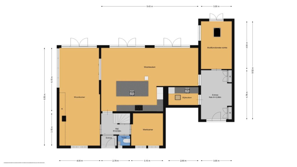 Daarnaast bevinden zich op de begane grond een kantoor, een ruime hobby-/sportruimte met vliering, een bijkeuken met keukenblok en de mogelijkheid voor een extra slaapkamer en badkamer.