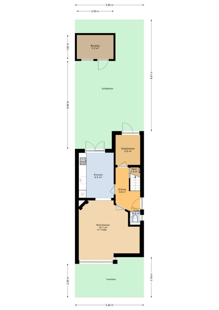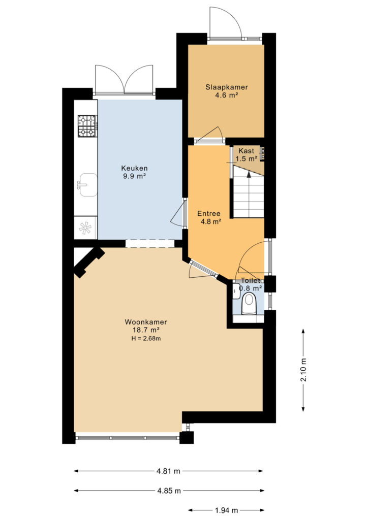 Entree, hal met trapkast en toilet. Woonkamer met erker aan de voorzijde en openslaande deuren naar de tuin aan de achterzijde. De halfopen keuken is voorzien van moderne apparatuur: gaskookplaat, afzuigkap, koel-vriescombinatie, combi-oven en vaatwasser.