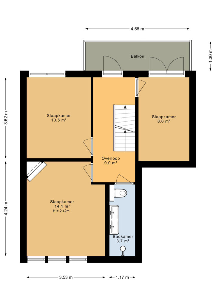 Overloop, drie slaapkamers: één ruime kamer aan de voorzijde en twee aan de achterzijde, waarvan één met toegang tot het balkon. Badkamer met inloopdouche, dubbele wastafel, toilet en designradiator.