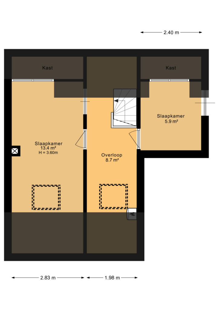 Vaste trap naar de zolderverdieping met twee volwaardige slaapkamers, beide voorzien van dakkapel. Tevens aansluiting voor wasmachine en droger, en opstelplaats voor de cv-ketel.