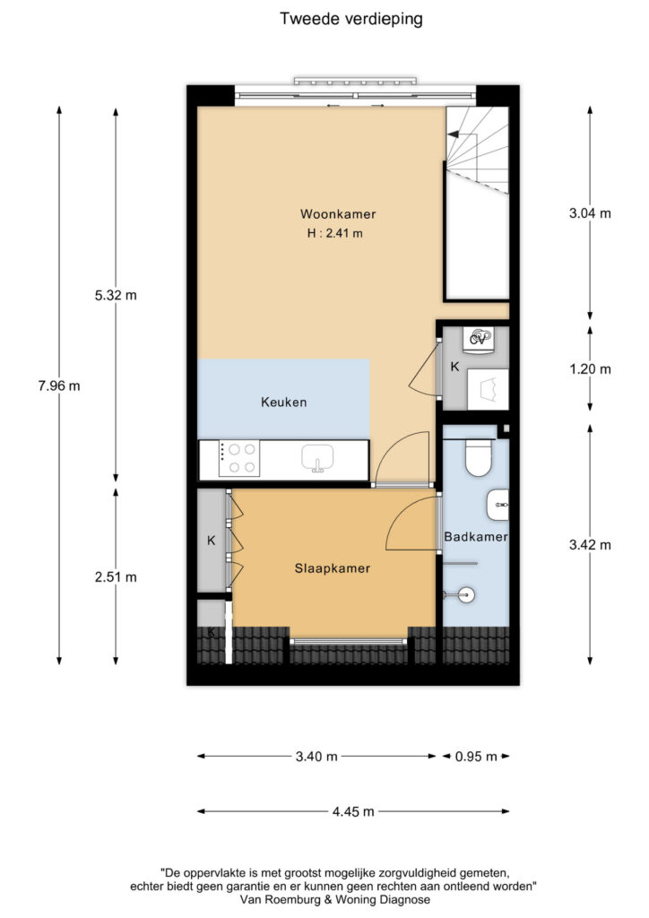 Overloop met wasmachine- en droger en toegang tot het dakterras middels openslaande deur. Verder vind je hier een slaapkamer met airconditioning, een werk-/studeerkamer, een badkamer met douche en toilet en een lichte woonkamer met keuken.